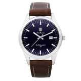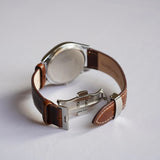 Dit klassieke, hoogwaardige horloge heeft een analoog Quartz uurwerk met keuze uit een bruin leren, groen leren, grijs-stoffen of een licht bruin stoffen bandje.
